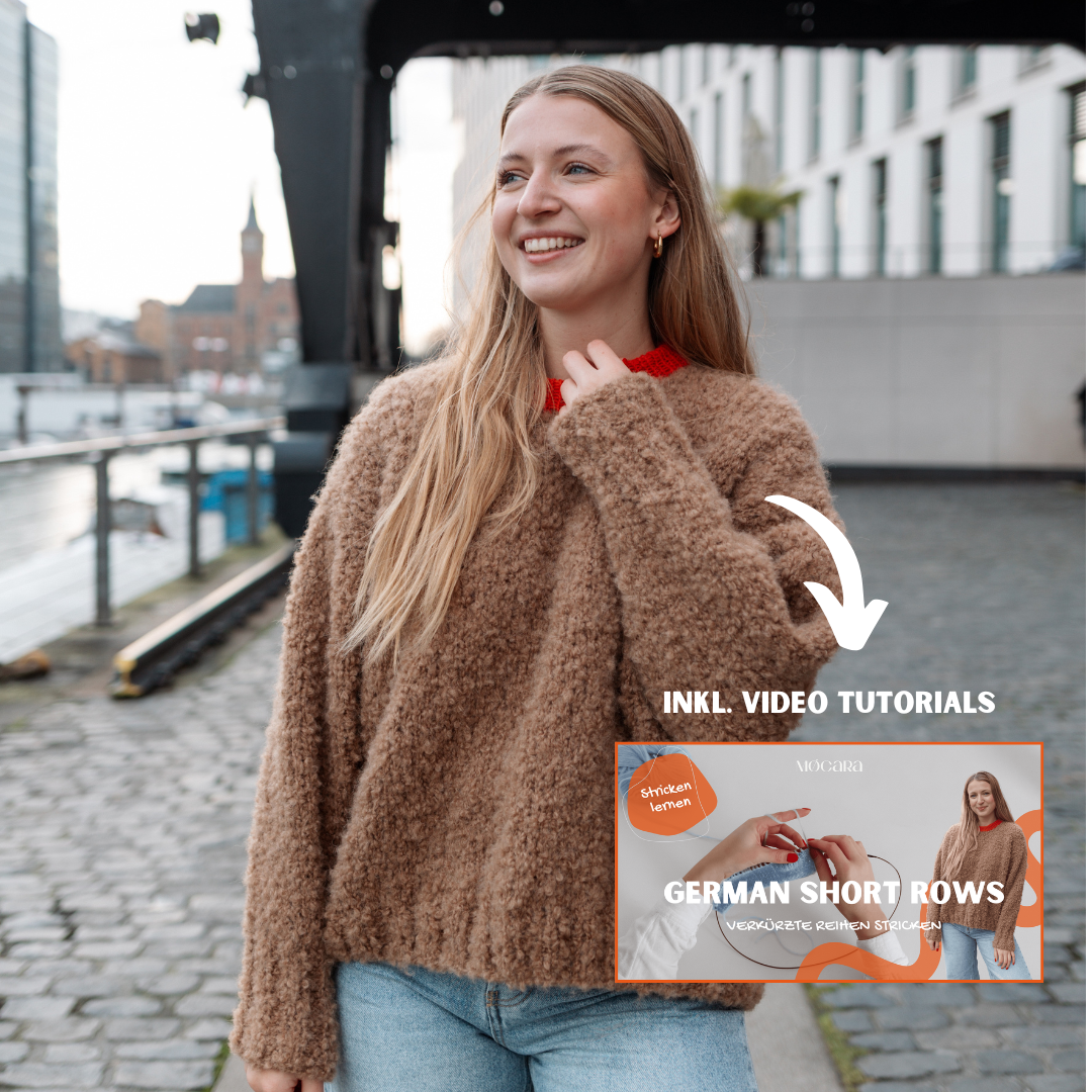 Der Sweater wird von oben nach unten gearbeitet – du beginnst mit dem Rückenteil, strickst dann die Vorderteile samt Rumpf und schließt schließlich mit den Ärmeln ab. So entsteht Stück für Stück dein persönliches Wohlfühl-Teil!